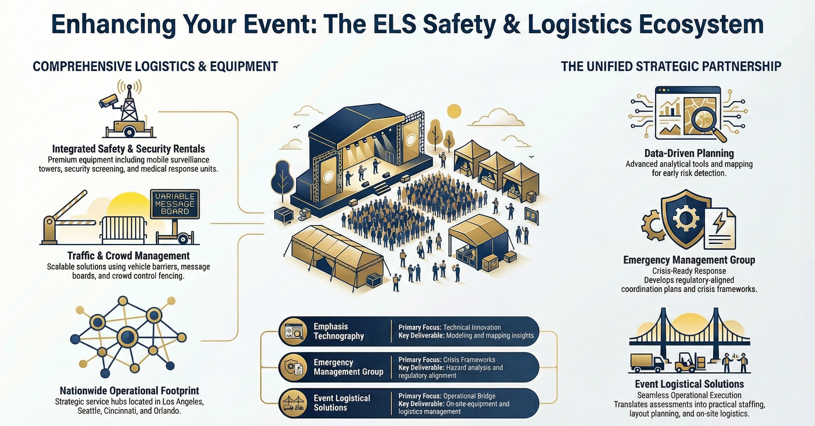 At Event Logistical Solutions (ELS), we believe world‑class events are built through collaboration. That’s why we’ve formed a unified, strategic partnership network designed to elevate every aspect of event safety, logistics, and operational intelligence.